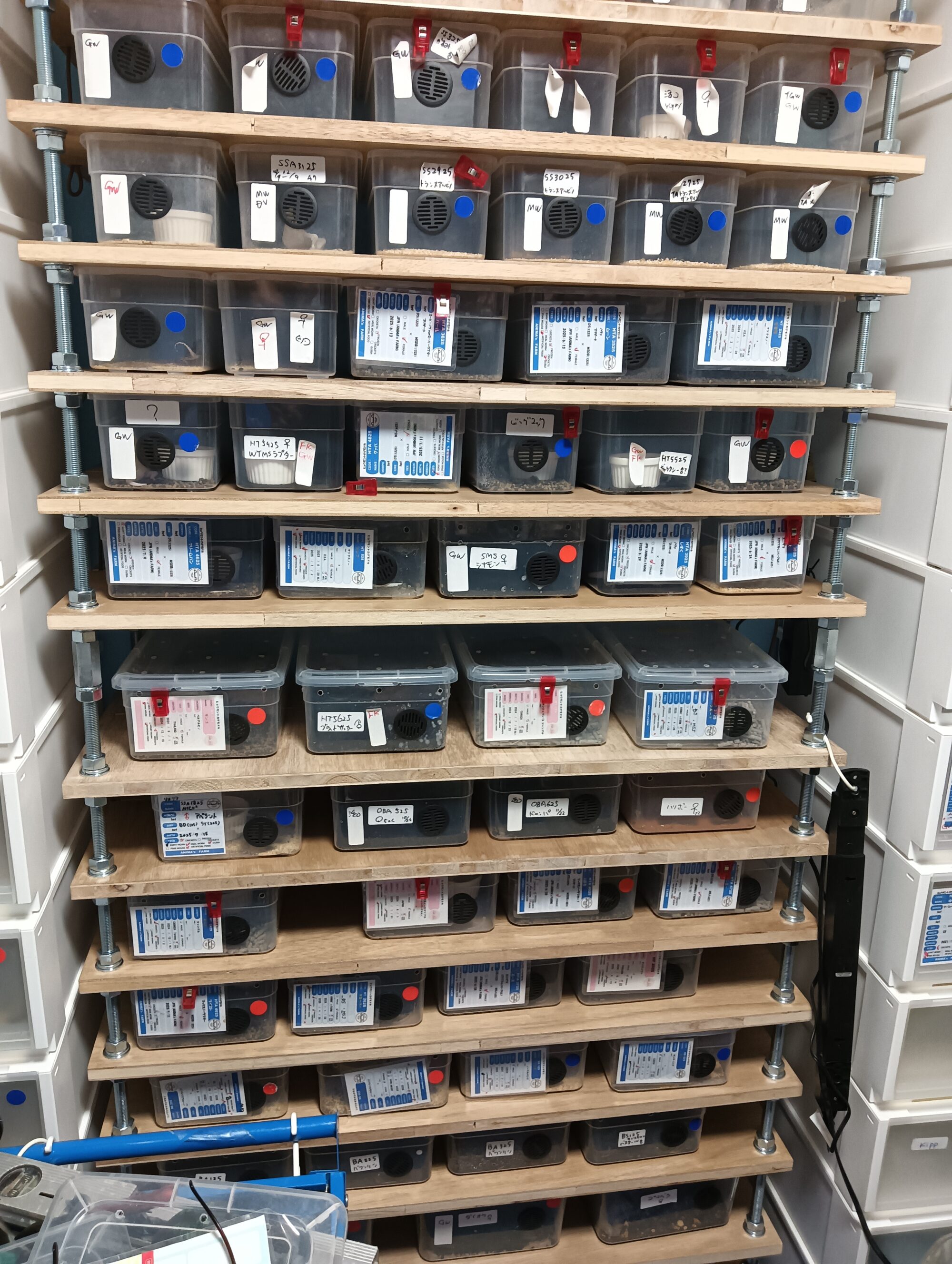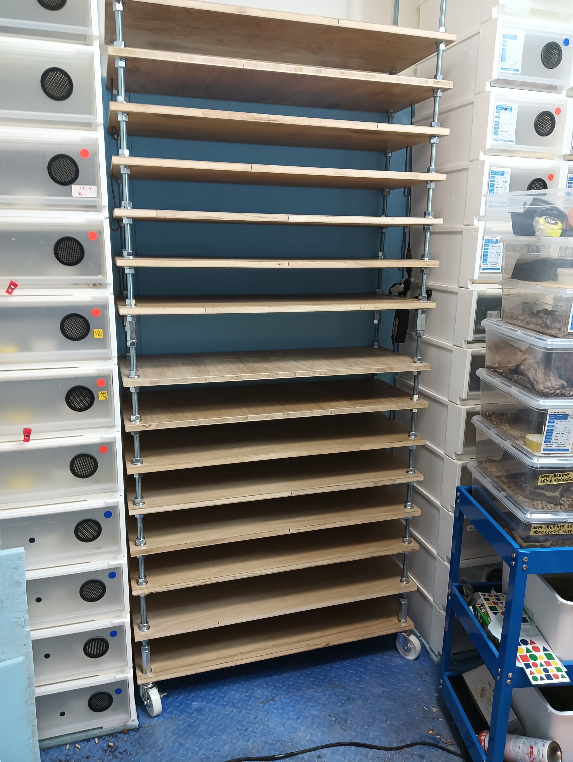 この他に従前からの 衣装ケース改造のものを100個位つかいますが このタイプの ブリーダーズラックは 小さい個体などにはかなり使いやすいので ベビーが孵るシーズンにはいれば もう一基作ってみようと思います。